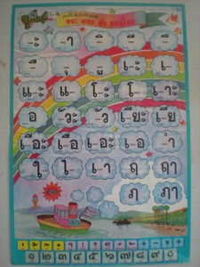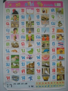 I must tell you that the Thai language has 44 letters in the alphabet. Also there is another chart of 36 vowels, or sounds you might call them, that change the way you pronounce the letters. These 36 sounds can be written at times above the letters, underneath, behind or in front. Each way brings a different sound, or just as importantly a higher or lower tone of voice. Anyway, just be informed I found it difficult, and do not at all have it mastered. The letters are fasinating and I love to draw them and try to sound them. My vocabulary to this point is very small.